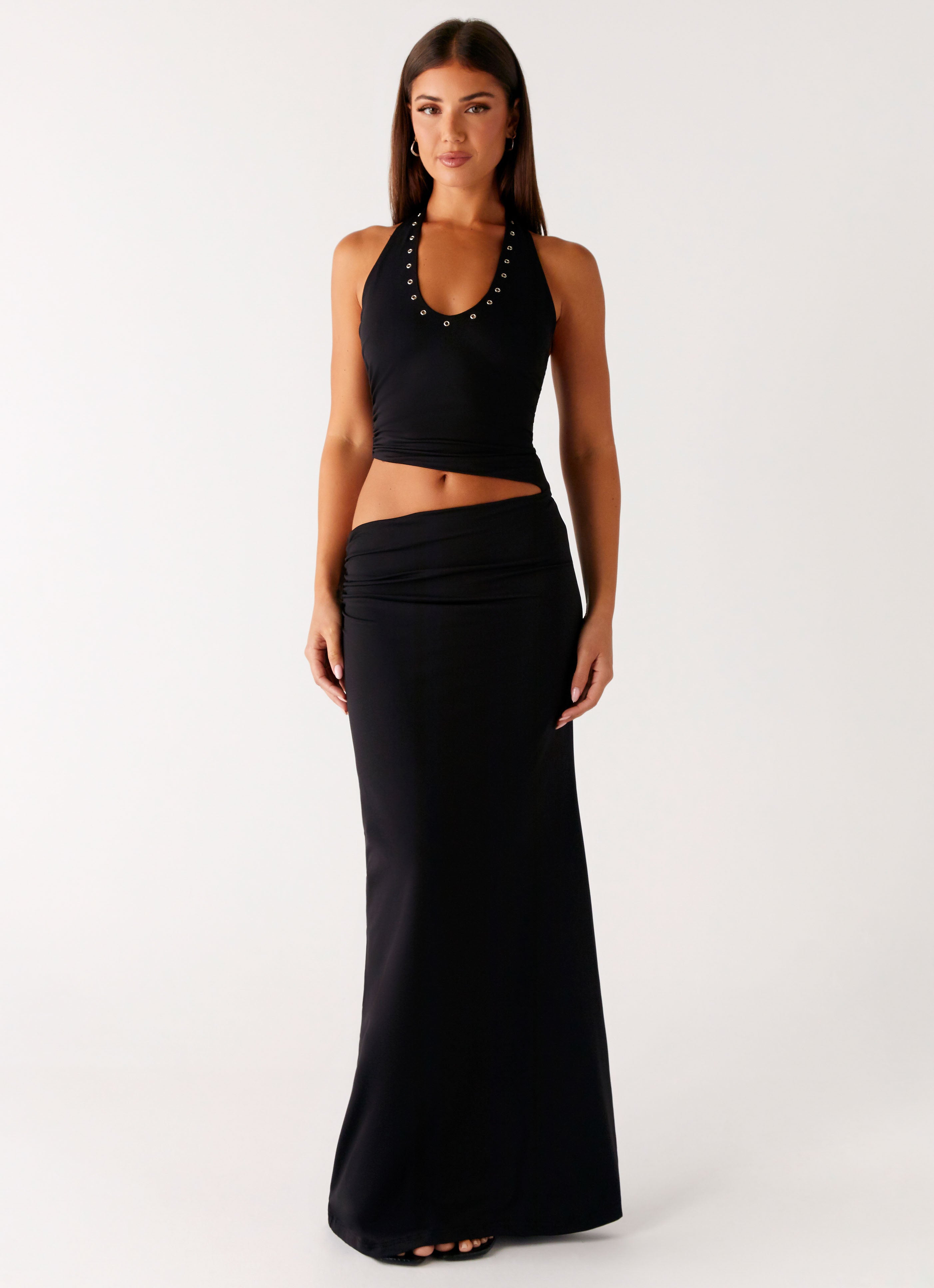 The Chella Maxi Dress is made for main character moments. Featuring a halterneck line with bold eyelet detailing, side cut outs, and a sleek black silhouette, it brings just the right mix of edge and elegance for every after-dark agenda.