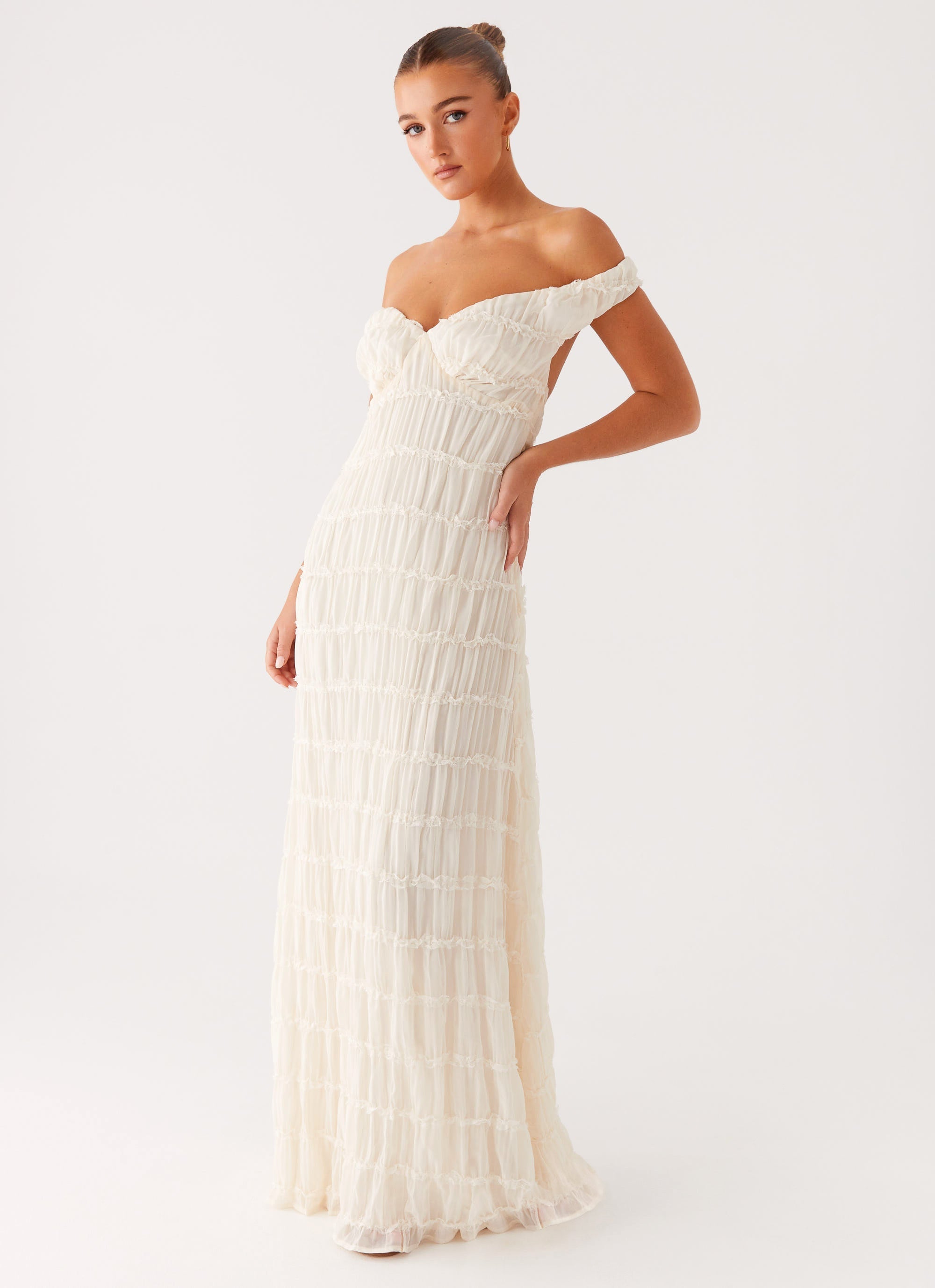 A romantic off-shoulder maxi dress crafted from textured fabric. Featuring an elasticated back strap for comfort and a fully lined silhouette for a seamless finish.