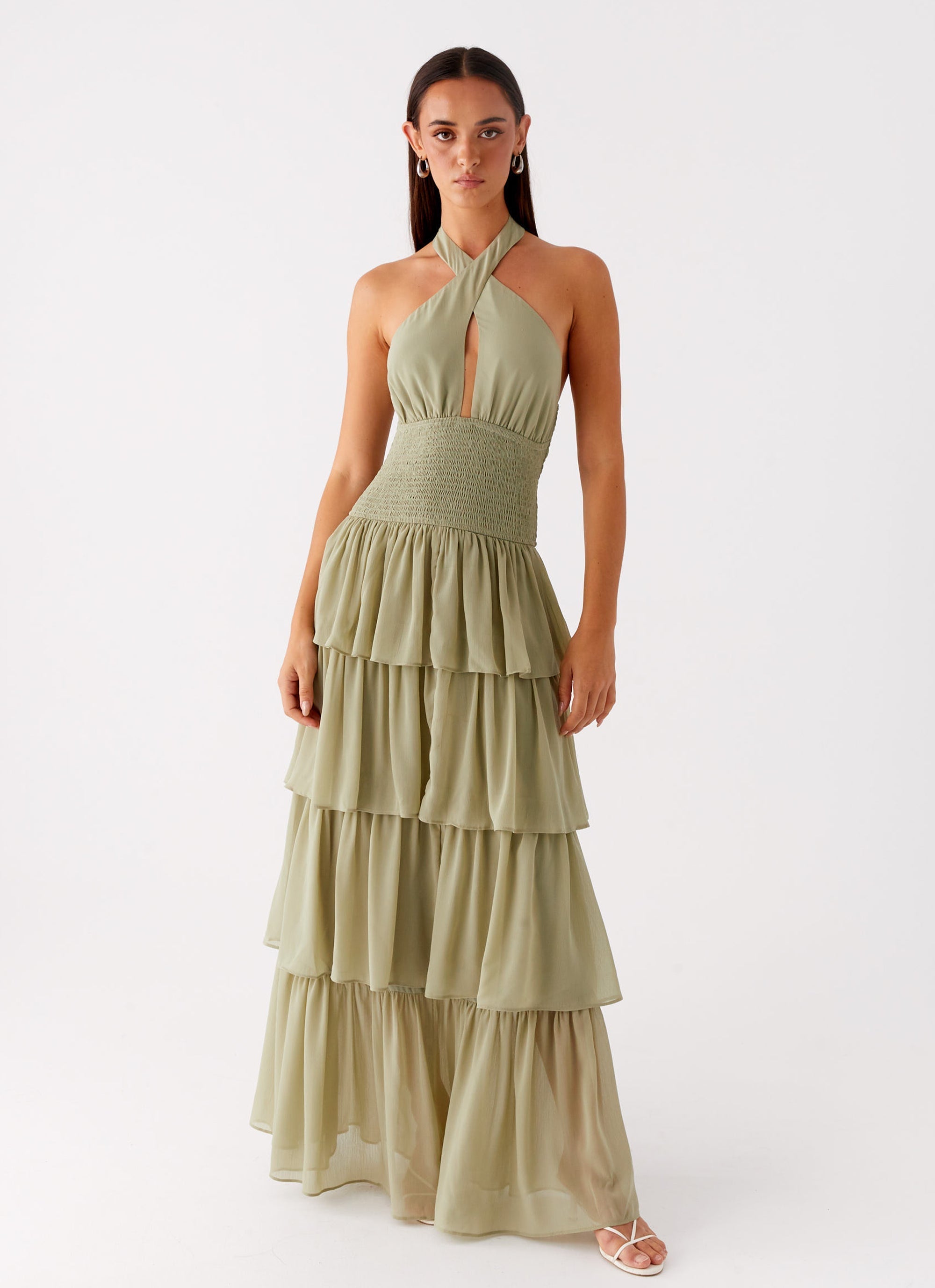 The Salma Maxi Dress in soft sage features a bold criss-cross neckline and an open centre front window. With a shirred bodice and dropped waistline, it offers a flattering, structured fit that flows effortlessly for any occasion.
