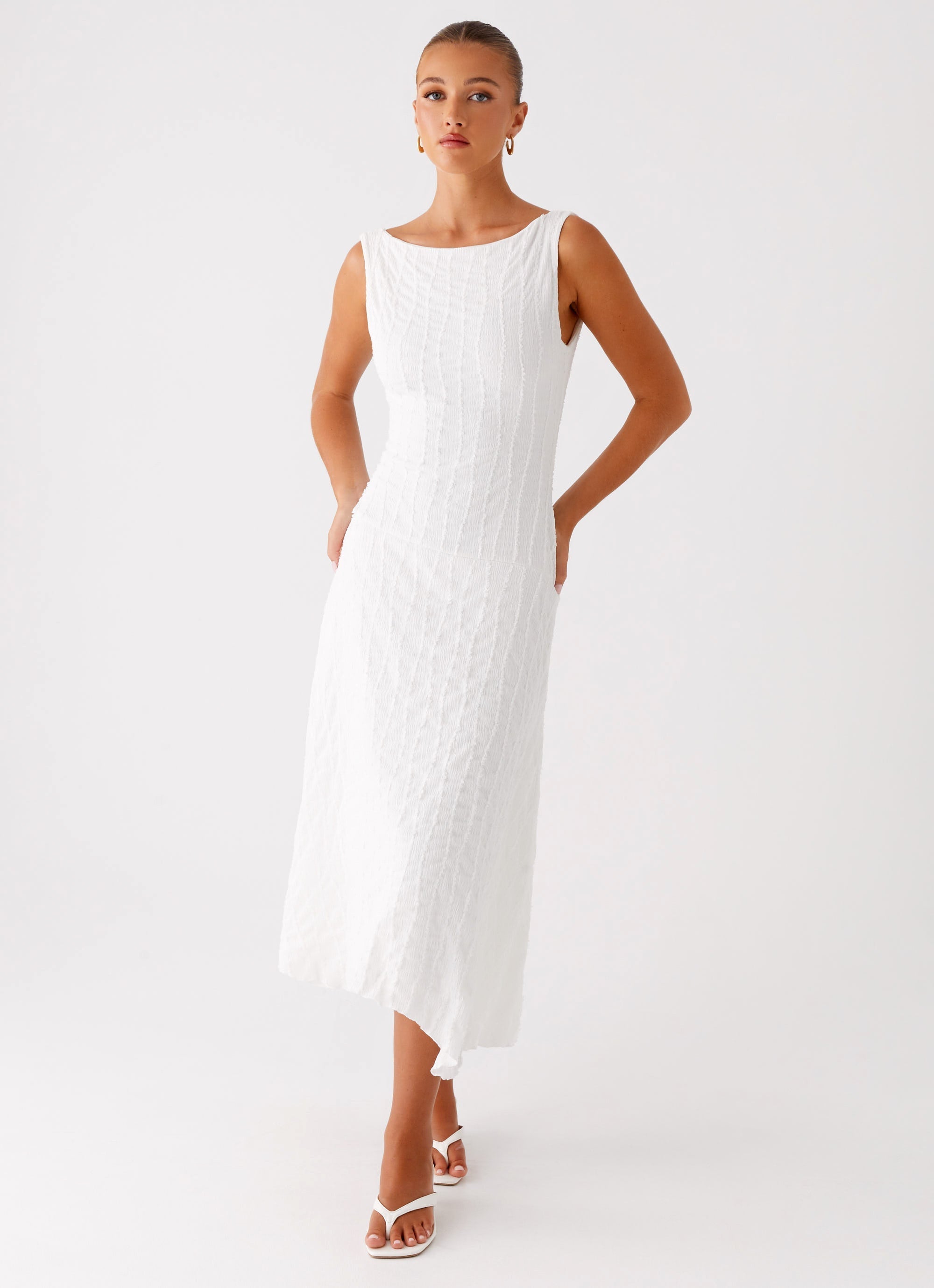 The Sharni Midi Dress blends modern sophistication with comfort, featuring a flattering drop waist and midi length. Its wide neckline and textured fabric give it a unique, relaxed feel, while being fully lined for a smooth and comfortable fit.
