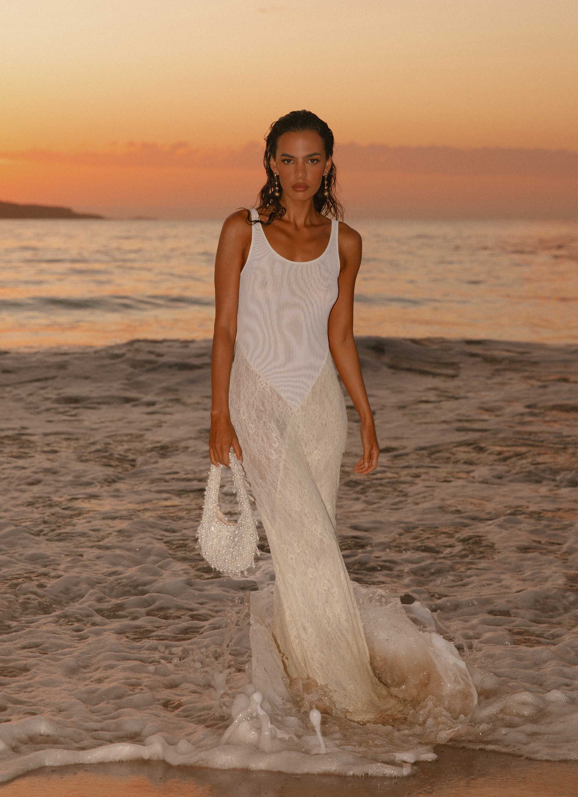 Meet the Twilight Dreams Maxi Dress. A captivating design with a flowing maxi length, a soft scoop neckline, and a stunning combination of mesh and lace that creates an enchanting silhouette, perfect for those dreamy, moonlit nights.